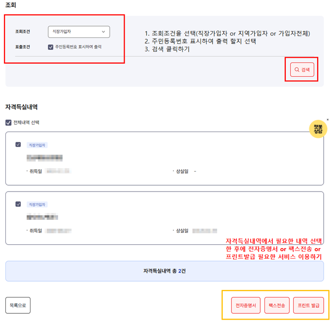 아래 자격득실내역에 조건에 맞는 내역이 나옵니다.