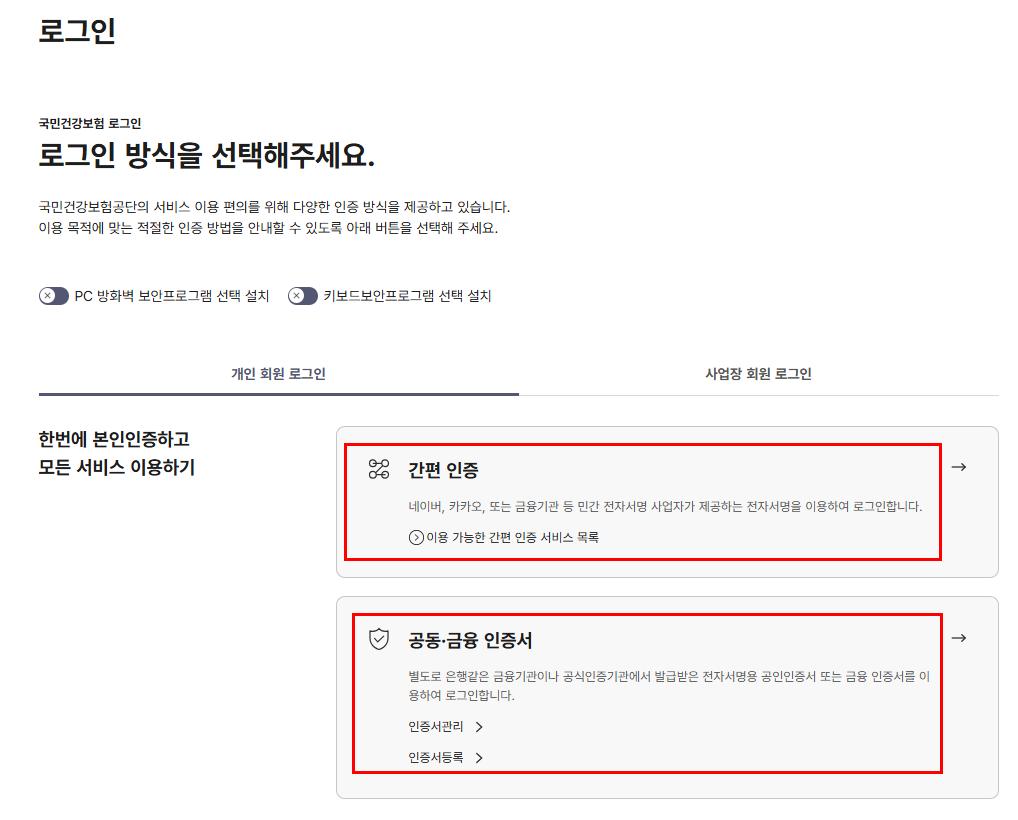 - 공동인증서 또는 간편인증(PASS, 카카오 등)
