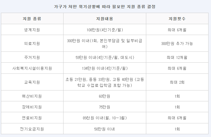 | 위기 상황 | 중한 질병 또는 부상, 입원·수술 필요, 주소득자 실직·사망·휴업 등으로 소득 상실, 자연재해·주택 화재 등으로 생활 곤란한 경우 등 |