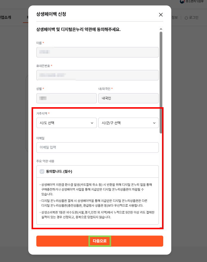 아래 거주지역과 이메일 주요약관을 순서대로 입력, 약관 동의에 체크해주세요.