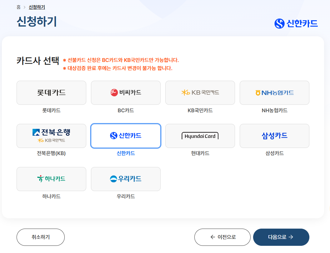 *선불카드 신청은 BC카드와 KB국민카드만 가능합니다.