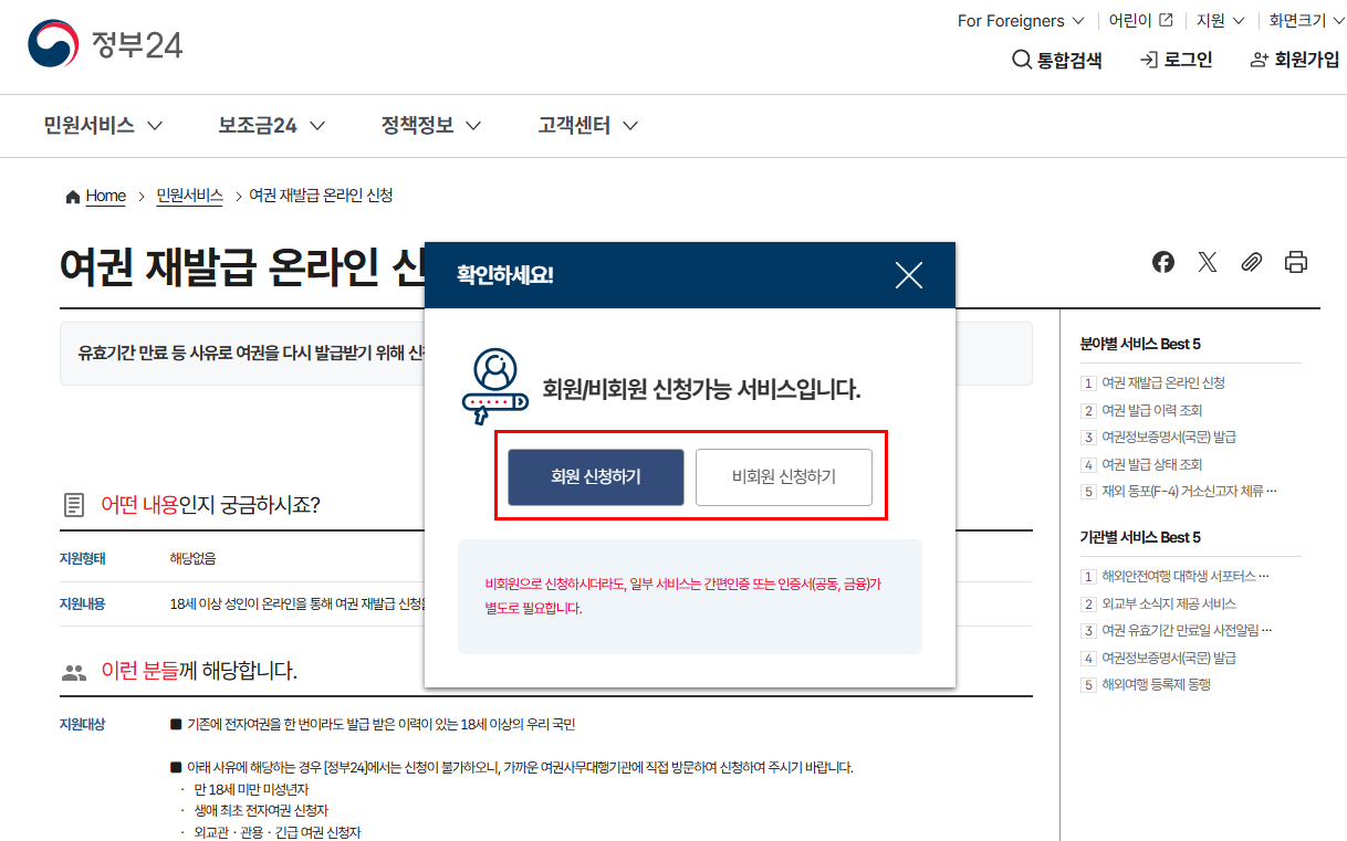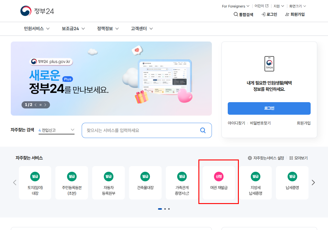 - [자주찾는 서비스] → [여권재발급] 클릭