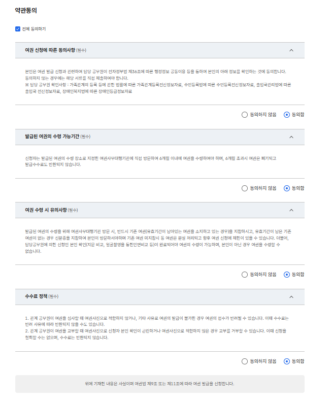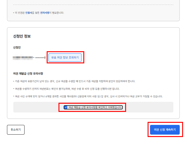 - 유효여권 정보 조회 → 유의사항 확인 후 신청 계속
