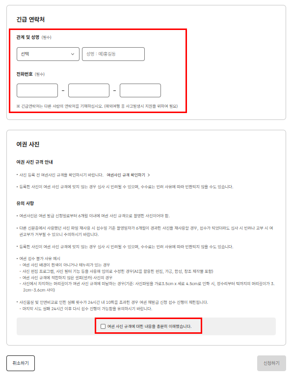 긴급 연락처 입력 후 여권사진 규격에 대한 내용을 충분히 이해했습니다. 체크해 주세요.