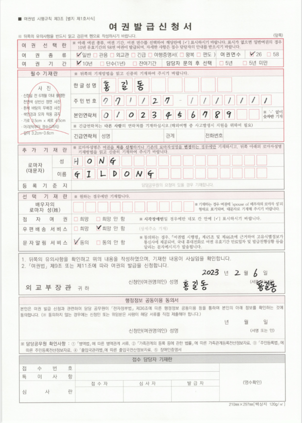 여권발급 신청서 작성 예시
