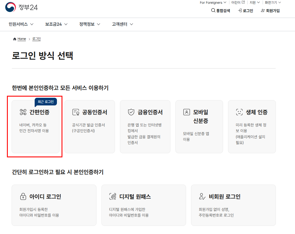 로그인 방식 중에 편한 방법 선택해 주세요. 저는 간편 인증으로 진행해 보겠습니다.