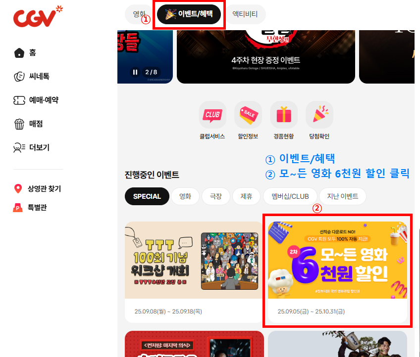 영화관 홈페이지나 어플을 들어가면 홈페이지에 들어가자마자 팝업창으로 보이거나, 이벤트 페이지에 들어가면 위 사진처럼