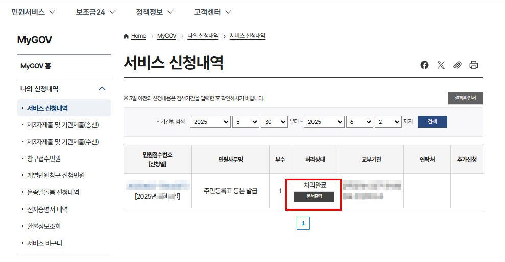 - 서비스 신청내역에서 문서출력 클릭 → 정보 확인 후 인쇄
