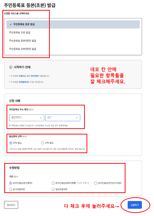 *주민등록등본과 주민등록초본 중에 필요한 서류를 체크해주세요.