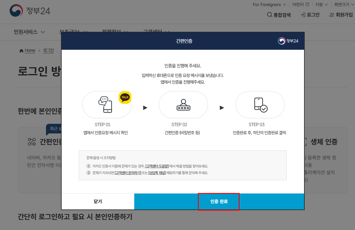 - ‘발급하기’ 클릭 후 로그인 (간편인증 가능)